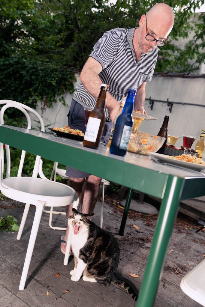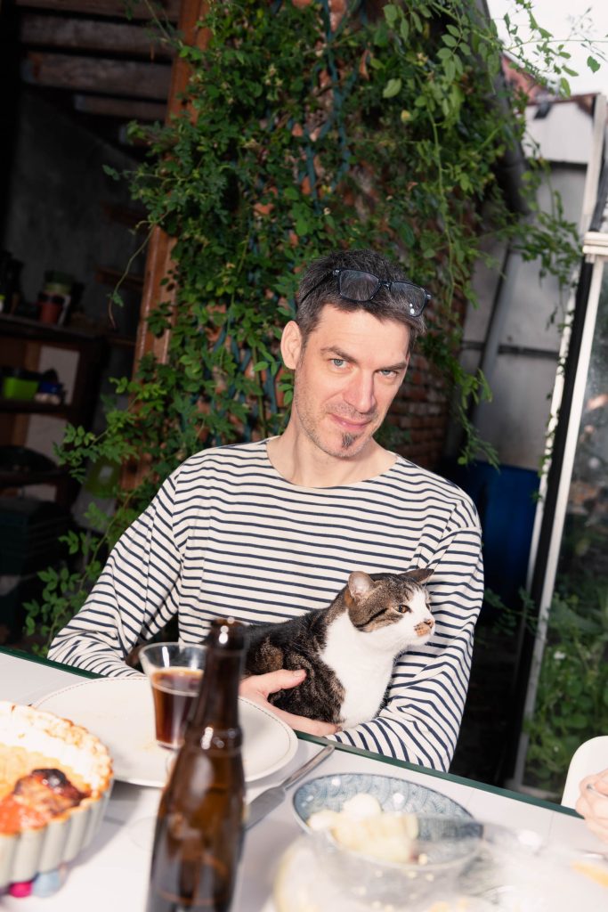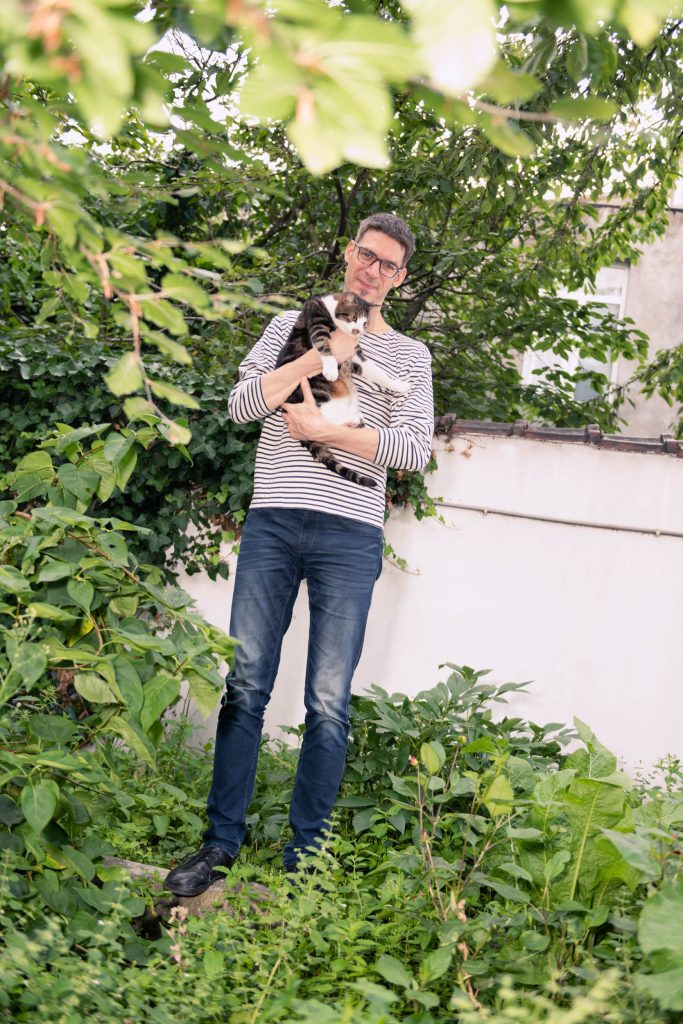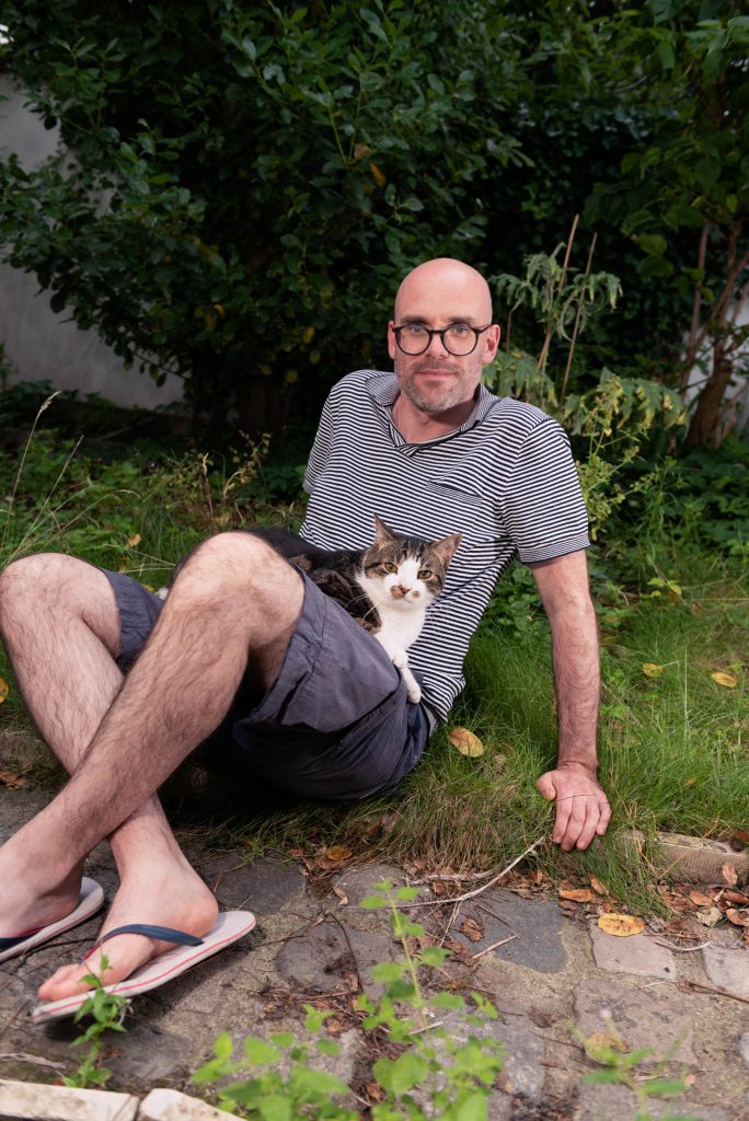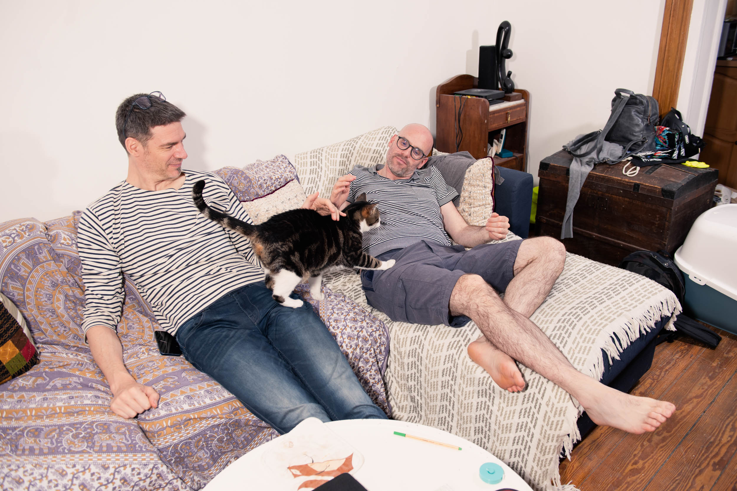 Family portrait of Jérémy, Eoin and their cat Chipo.