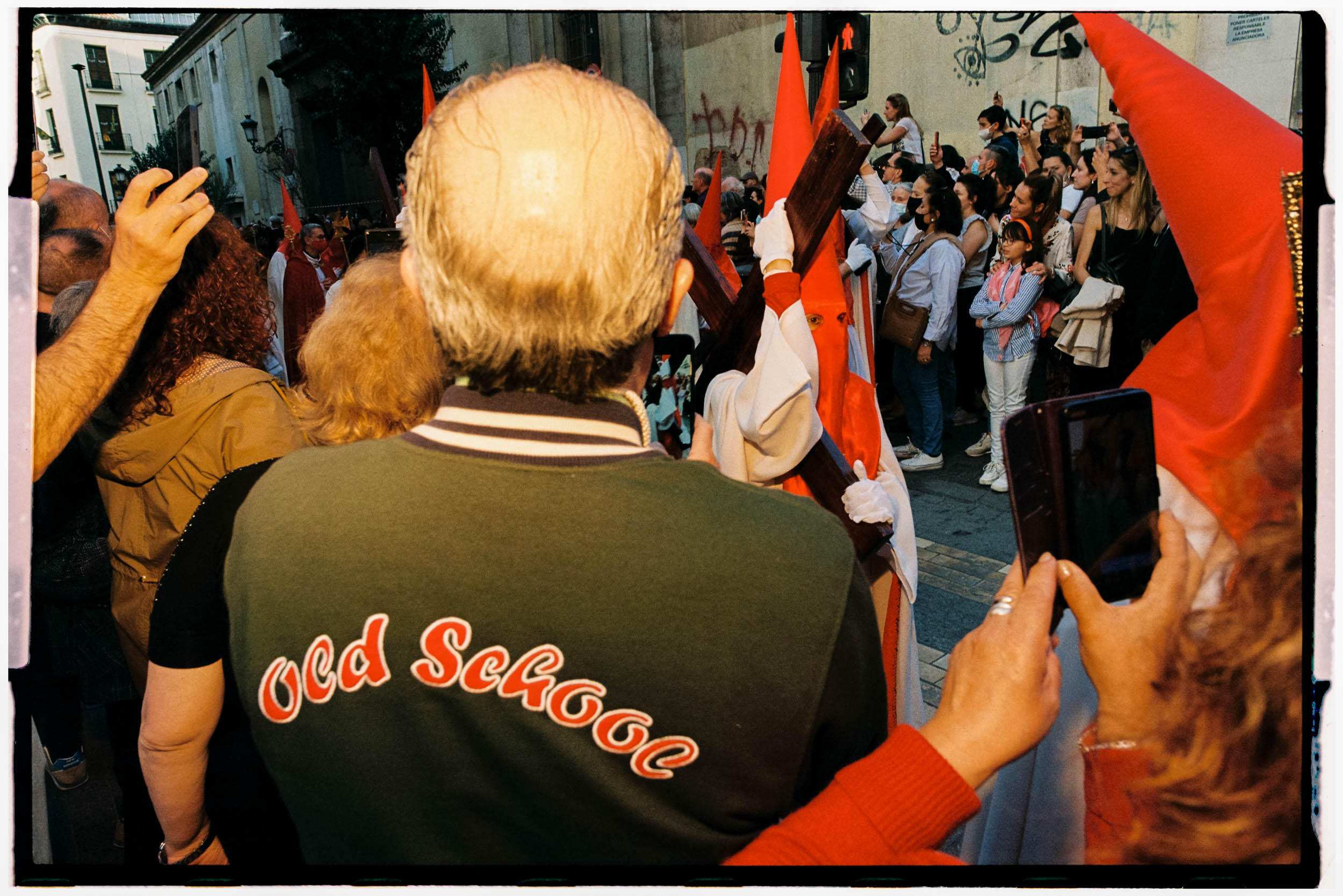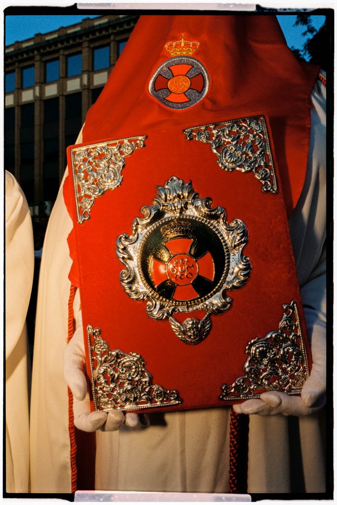April 2022, final moments of the COVID-19 era: for two years, there had been no Holy Week processions in Madrid – the most striking mass events of Spanish Christian liturgy. Thousands if not millions of people crowd together on the streets to watch devotees parading past, carrying heavy pasos (sculptural representations of Virgin Mary or Jesus, weighing as much as your average car) on their backs. They are preceded and followed by other believers wearing strange ritual attire, their feet in chains, carrying a cross upon their shoulders, with music and chanting to accompany this display of their faith. What would the return of those days of celebration and religious expression look like in 2022 Madrid?