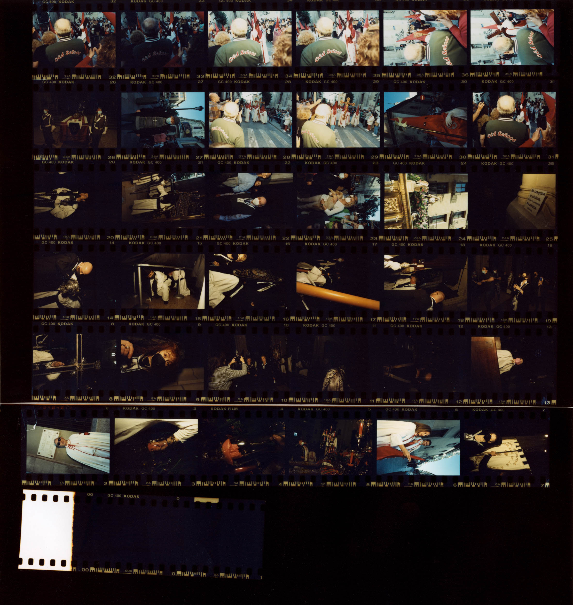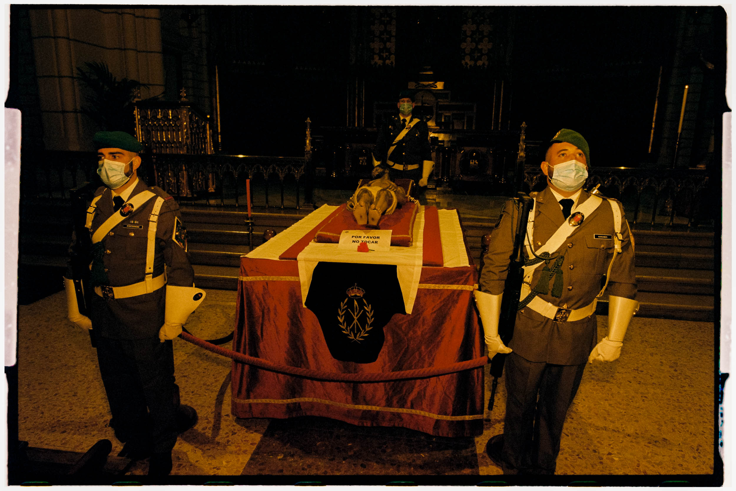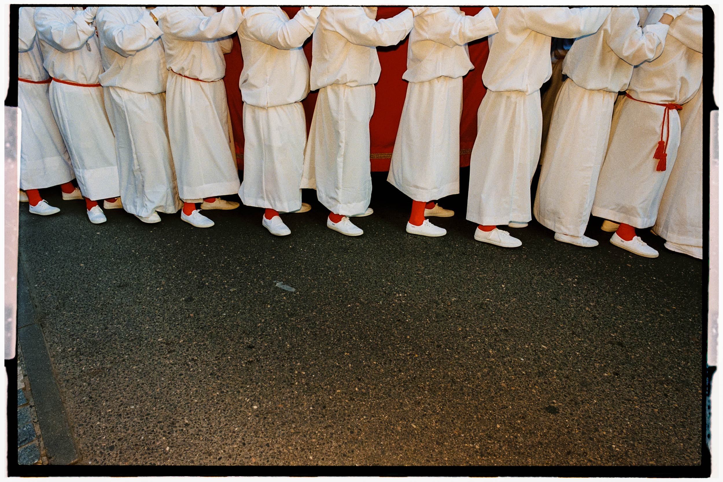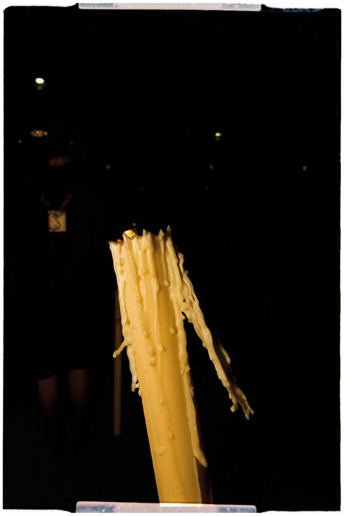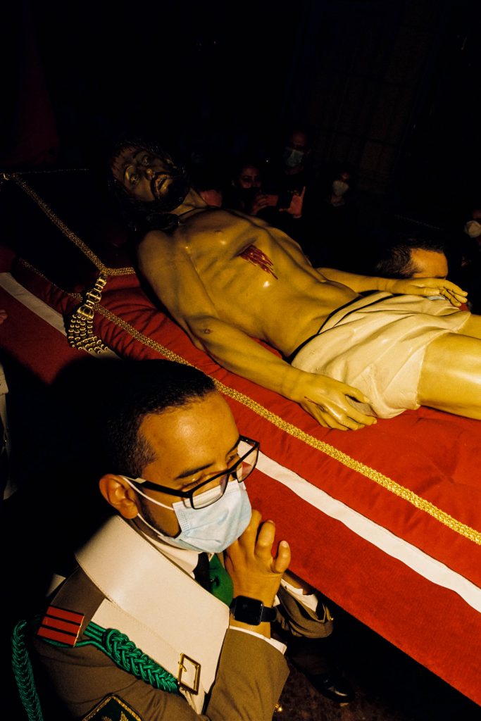 As the afternoon advanced and the night came, fatigue, the heaviness of the bodies under the pasos, the onlookers’ faces, the regular rhythm of footsteps, everything became increasingly solemn, and some sort of sorrow overtook me. Shooting with my flash felt like lighting a match that threw light on my surroundings and my spirits for just a few thousandths of a second. The presence of light, so important for these traditions, connected to divine love, was conspicuous by its absence, limited as it was to some altar candles here and there and the medium intensity of street lights under which the processions passed. After every flash, the dark returned, and my mood sunk further.